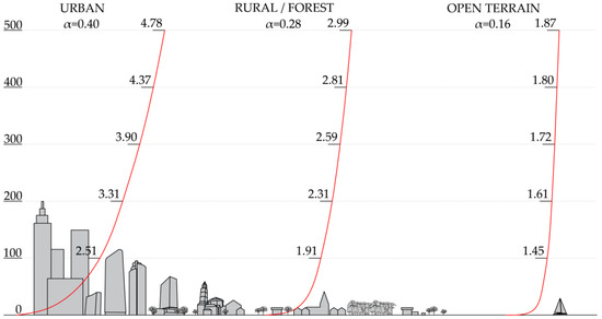 In the meteorological stations, wind speeds are measured at the height of 10 m above the ground, according to EN 1991-1-4:2012/NA:2012 [40]. An air mass moving near the ground is slowed down by terrain roughness, which depends on the type of surface, resulting in different windspeeds depending on the altitude. The greatest terrain roughness is in urban areas, while the lowest is in open terrain and water, expressed by Hellman’s coefficient, α [−]. Windspeed differences for different altitudes are expressed by the wind gradient, w [−] (Equation (5)). Figure 8 shows the wind gradients for urban areas and rural and flat terrain [41,42]. Since the windspeeds are different at different heights, different pressures are exerted on the envelopes of buildings, and a different number of air exchanges are expected on different floors.