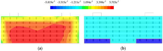 Pressure differences on opposite sides of the building; (a) windward, north façade; (b) leeward, south façade, for the windspeed of 1 m/s.