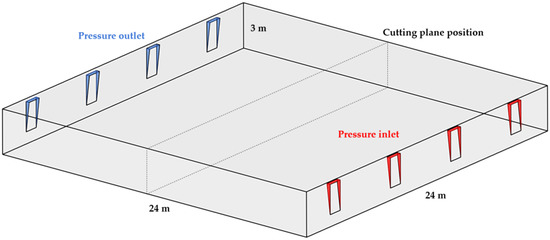 After the pressure differences on the opposite building sides were determined, only a 24 × 24 × 3 m layout segment was observed. There are four top-hung openings placed on both the north and south sides of the office area segment, making the total top-hung opening area on each side 3 m2. The air exchange number obtained in the analysed segment was applied to the building model as a whole.