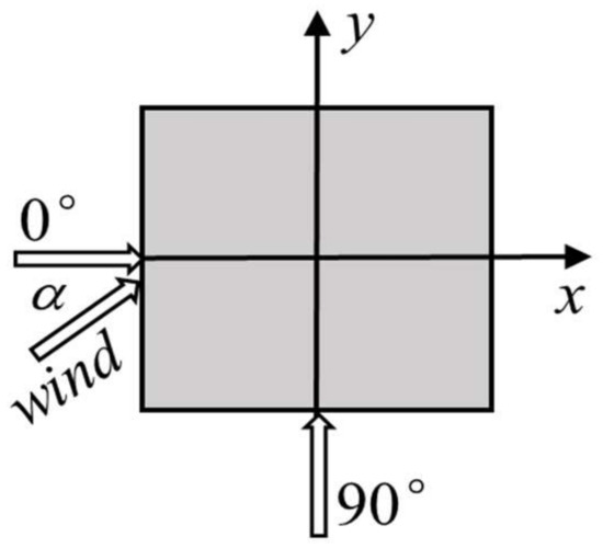 A base-isolated high-rise building, as well as the corresponding fixed-base building under different wind speeds and different wind directions are considered in this study. A Cartesian coordinate system with two orthogonal translational axes x, y and a vertical axis z, whose origin is the geometric center of the base, is used to describe the building system as shown in Figure 1, as typically done in the current literature [34]. The wind direction is for wind blowing in the positive direction of x, and is for wind blowing in the positive direction of y.