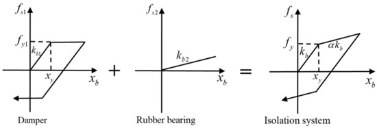 where and are the mass of the isolation system and the total mass of the superstructure, respectively; is the damping coefficient of the isolation system; is the restoring force provided by the isolation system [32,35]: