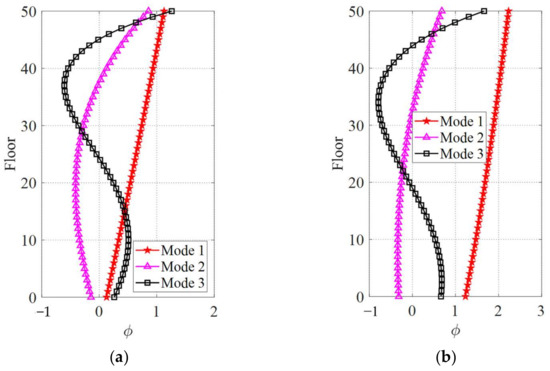 A 50-story fixed-base high-rise building with a cross section of is chosen as an example. The total building height and story height are 200 m and 4 m, respectively. The building is modeled as a lumped mass system with a density of 192 kg/m3. The first modal frequency in each translational direction is assumed as = 0.23 Hz [46], where H is the building height. The first modal shape in each translational direction is assumed to be linear, i.e., . The story stiffness, which is assumed to vary over the building height is calculated from the fundamental natural frequency and first modal shape as