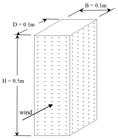 The wind force used in this study was derived from the multiple point synchronous scanning of pressures on the building model surface in a wind tunnel at the Tokyo Polytechnic University [48]. The wind pressure data used in this study were carried out with a model scale of 1/400. Additionally, the power law exponent of the mean wind speed profile is 1/4. The size of the building model is . A total of 500 wind pressure taps were uniformly distributed on the four surfaces of the building model, as shown in Figure 5. The mean top wind speed in the wind tunnel is 11.14 m/s.
