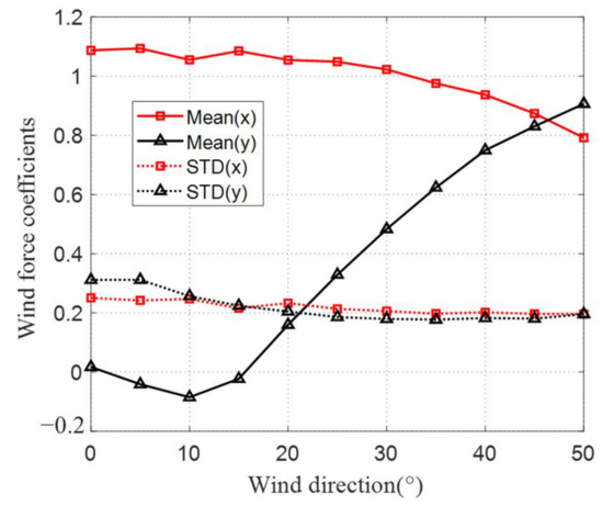 The story wind forces are determined by integrating wind pressures within the tributary area. When there is no wind pressure tap located, the story wind force is determined by interpolating the story forces acting on the two adjacent stories. When analyzing the influence of wind direction, wind pressure is measured by rotating the model surface 5 degrees each time. The mean and STD of the modal force coefficients of the superstructure associated with the fundamental and second modes are presented in Table 1, which is defined as the ratio of the modal force to the wind speed pressure at the building top and the building frontal area, i.e., . Figure 6 shows the external wind force coefficients in different wind directions applied on the isolation system, where the coefficients are normalized by .