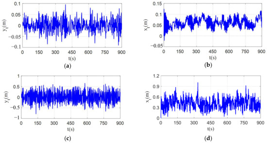 The first 900 s time histories of the building top and base responses are displayed in Figure 7 and Figure 8. The results indicate that when the wind force contains a non-zero mean component, the inelastic base displacement drifts with each yielding in the positive direction and vibrates at the new equilibrium position, just as shown in Figure 8d,f. This kind of inelastic displacement can be modeled as a zero mean fluctuating process due to dynamic effect with a time-varying mean component, and the steady-state mean displacement can be well estimated by the second stiffness of the isolation system and the mean wind force [11,16]. In addition, the time-varying mean base displacement reaches its steady-state value very fast at high wind speed, but experiences a long transient process when the wind speed is not high enough, just as shown in Figure 8d,f. In order to reduce the transient effect on the STD and peak value of the inelastic response at low wind speeds, the discrete wavelet transformation (DWT) method is used to remove the time-varying mean component of the response history. Symlets wavelets with an order of 8 and a DWT level of 12 are used in this study for extracting the drift component.