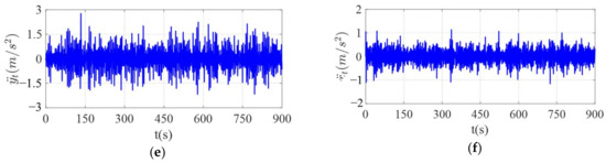 Time history samples of top response: (a) displacement in the y direction, UH = 30 m/s; (b) displacement in the x direction, UH = 30 m/s; (c) displacement in the y direction, UH = 80 m/s; (d) displacement in the x direction, UH = 80 m/s; (e) acceleration in the y direction, UH = 80 m/s; and (f) acceleration in the x direction, UH = 80 m/s.