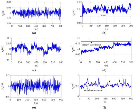 Time history samples of base displacement: (a) displacement in y direction, UH = 30 m/s; (b) displacement in x direction, UH = 30 m/s; (c) displacement in y direction, UH = 45 m/s; (d) displacement in x direction, UH = 45 m/s; (e) displacement in y direction, UH = 80 m/s; (f) and displacement in x direction, UH = 80 m/s.