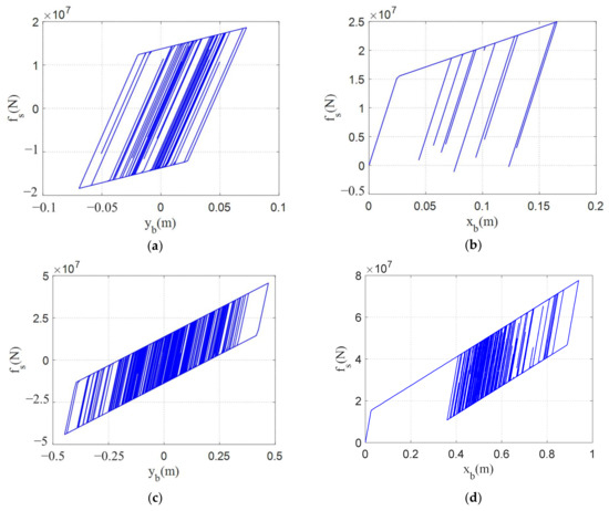 Restoring force–deformation relation of the base isolation system: (a) y direction, UH = 45 m/s; (b) x direction, UH = 45 m/s; (c) y direction, UH = 80 m/s; and (d) x direction, UH = 80 m/s.