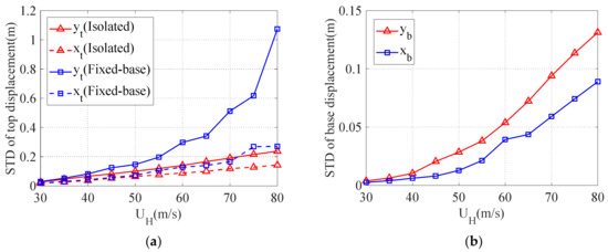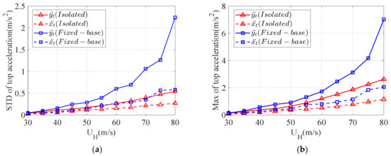 The statistics of each response are determined based on each 10 min response history. Figure 10 shows the STD of displacement as a function of wind speed. It is evident that the STD of displacement in the y direction of each building model is larger than that in the x direction under the condition of high wind speed. Figure 10a also indicates that the STD of the inelastic top displacement of the base-isolated building is smaller than that of the corresponding fixed-base building due to the additional hysteretic damping of the isolation system after yielding and the additional linear damping of the isolation system.