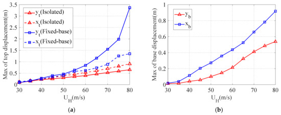 Figure 9 shows the restoring force–deformation relationship of the base isolation system. In this study, the yield of the isolation system can be observed in each translational direction when UH reaches 35 m/s. However, when the wind speed is not high enough, it is difficult for the isolation system to yield in the negative x direction, just as shown in Figure 9b.