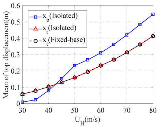 When the wind is blowing perpendicular onto a face of the traditional fixed-base high-rise building, previous studies showed that the peak value of the fluctuating component of displacement in the crosswind direction can be two to five times greater than that in the along-wind direction. Furthermore, even when the mean component of the along-wind displacement is taken into account, the peak displacement in the crosswind direction is still one to three times greater than the peak displacement in the along-wind direction [23]. Figure 11 portrays the peak values of base and top displacement at different wind speeds in this study. The peak value of the stochastic process is calculated by the Davenport formula as [50], where the non-Gaussian peak factor g is determined by Section 2.2, and the value of the mean displacement is the steady-state mean. It can be found that the peak values of both the inelastic base and top displacement in the x direction of the base-isolated building are larger than those in the y direction, which is opposite to that of the fixed-base building. This phenomenon shows that the generally accepted belief proposed by Reinhold [23] mentioned before is no longer applicable to the wind-induced inelastic response of the base-isolated building, where the mean drift of the isolation system and the non-Gaussian characteristics need to be considered. The peak of the inelastic top displacement of the base-isolated building is smaller than that of the corresponding fixed-base building. The mean component of displacement in the x direction is shown in Figure 12, from which we can find that the mean top displacement of the base-isolated building is equal to that of the fixed-base building. Additionally, the deformation of the isolation system under the mean wind load increases very significantly after yielding.