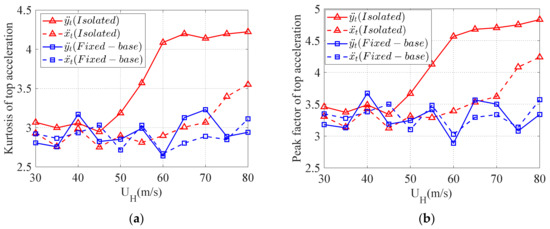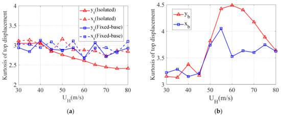 Figure 14, Figure 15 and Figure 16 display the kurtosis and corresponding non-Gaussian peak factor, where the non-Gaussian peak factor is determined by Equations (15) and (18). As a comparison, the Gaussian peak factor of each response history is also calculated according to the Davenport method [50], and their values all range between 3.2 and 3.4 in this study. The results in Figure 14 and Figure 15 show that as the wind speed increases, the inelastic top displacement in the y direction of the isolated building has a weakly hardening non-Gaussian characteristic with a kurtosis smaller than three, and the peak factor is also smaller than the Gaussian peak factor. The top displacement in the two translational directions of the fixed-base building and the inelastic top displacement in the x direction of the isolated building all follow almost Gaussian distributions. The base displacement in both the x and y directions, as well as the top acceleration in the y direction of the isolated building, have a strong softening non-Gaussian characteristic with kurtosis greater than three, and the peak factors are also greater than the Gaussian peak factor. Additionally, the top acceleration in the x direction also shows a weakly softening non-Gaussian characteristic when the UH is larger than 70 m/s. Referring to Figure 10, Figure 11 and Figure 15, we can also find that the reason for the smaller inelastic top displacement in the y direction is determined to be the reduction in the peak factor due to the hardening non-Gaussian distributions. Unlike the top displacement, the larger value of base displacement in the x direction is mainly due to the contribution of drifted mean displacement.
