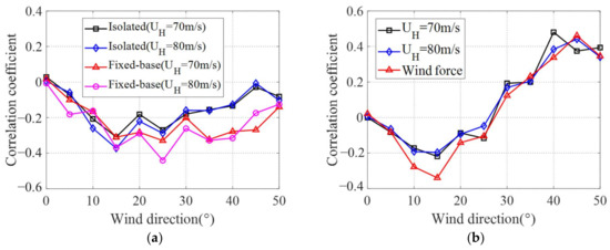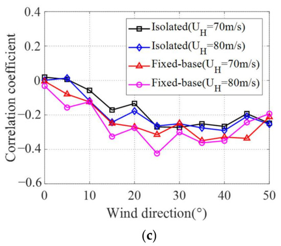 (2) When , the correlation coefficients for both the inelastic response of the base-isolated building and the elastic response of the fixed-base building can be ignored. With the increase in wind direction, the correlation coefficients of the top displacement and top acceleration of both the base-isolated and fixed-base buildings are all less than 0, and the minimum value is about −0.3 to −0.4. The correlation coefficient of the inelastic base displacement of the isolated building first decreases and then increases, which is similar to that of the external wind load acting on the isolation system.