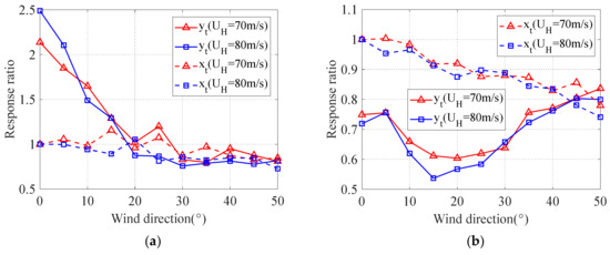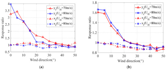 The response ratios of peak top displacement and acceleration are compared in a similar way in Figure 19. For the inelastic top acceleration of the base-isolated building, as well as the elastic top displacement and top acceleration of the fixed-base building, their most unfavorable wind direction is 0°, and their peak responses in the y direction are larger than that in the x direction. With the increase in wind direction, the peak responses in each translational direction gradually decrease until they are almost equal to each other around 45°. However, for the inelastic top displacement of the base-isolated building, the peak displacement in the y direction is smaller than that in the x direction. In addition, with the increase in the wind direction, the peak displacement in the y direction decreases first and then increases, and the maximum value is obtained around 45°. This significantly different response characteristic is mainly caused by the hysteretic damping and hardening non-Gaussian characteristic after the yielding of the isolation system. Therefore, it is no longer reasonable to determine the most unfavorable wind direction of the base-isolated building with hysteresis characteristics directly based on the peak displacement in each translational direction. The STD and peak value of the inelastic base displacement of the isolated building are also shown in Figure 20, from which we can see that the comparison result in the two translational directions is similar to the top displacement shown in Figure 18 and Figure 19.