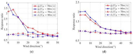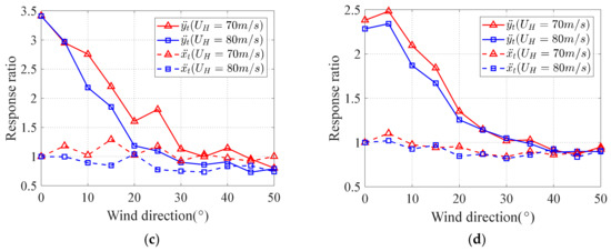 The performance assessment of a building under strong wind excitation requires not only the peak value of the independent response components in each direction, but also the peak value of the combined response. Previous studies show that both the response statistics and the correlation coefficients of each combination component have strong influence on the peak value of the combined response [51,52]. The correlation coefficients of each response in the orthogonal translational x and y directions calculated using each 10 min response history are shown in Figure 17. It is noted that the correlation coefficients for each response can be ignored when . With the increase in wind direction, the correlation coefficients of both the inelastic top displacement and top acceleration of the base-isolated building are negative, while the minimum value is about −0.3 to −0.4, which is similar to that of the traditional fixed-base building. For the inelastic base displacement of the isolated building, the correlation coefficient first decreases and then increases, which is similar to the correlation coefficient for the external wind load acting on the isolation system as shown in Equation (9). Additionally, the minimum correlation coefficient of base displacement is about −0.2 when is 15° and the maximum positive correlation coefficient is about 0.4 when is near 45°.