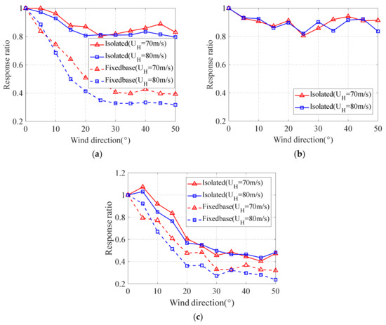 Response ratio of the combined response to that at configuration 0°: (a) top displacement; (b) base displacement; and (c) top acceleration.