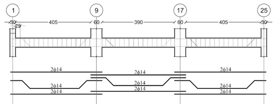 The concrete beams have been designed for gravity loads only with line loads that represented normal condition of occupancy according to the regulation before the 1981. The reinforcement layout has been based on numerously available technical drawings and the longitudinal reinforcement have been assumed straight and shaped. Figure 3 shows the external beam reinforcement layout in the shorter direction.