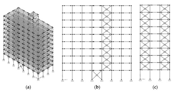 Based on the geometrical and mechanical properties of the above benchmark 3D frame building structure, a nonlinear FEM model has been implemented in the Sap2000 code [18]. The FEM accounts for the constitutive nonlinearity, P-Delta effects and spatial behaviour of the building. The 3D model (Figure 4) accounts for the effect of the non-uniform reinforcement layout of concrete beams, as already represented in Figure 3, by dividing all the beam FE elements in three parts. PMM and M plastic hinges have been applied to columns and beams, respectively. Each concrete beam can undergo plastic hinge occurrences that account for the irregularities due to the internal reinforcement layout. As reported in Figure 4b,c the infill frames are modelled by exploiting a single strut approach.