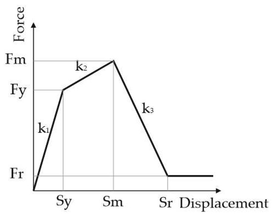 Each single strut has been modelled employing one nonlinear link with a nonsymmetric constitutive law based on the Panagiotakos and Fardis’s research [37], depicted in Figure 5.