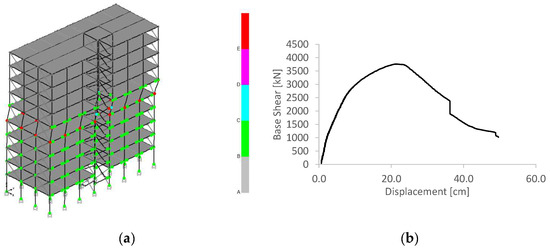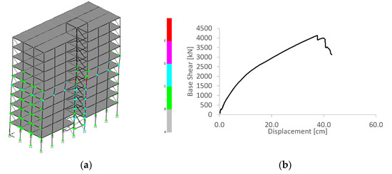 Pushover analysis, (a) deformed shape and (b) capacity curve in x directions.