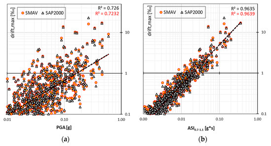 Detail of the Maximum Drift Ratios comparison in (a) PGA and (b) ASI scale.
