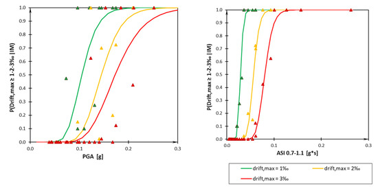 Finally, the fragility curves were computed for the drift values of 1, 2 and 3‰ in PGA and ASI IM scales as the Figure 10 reports.