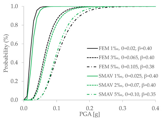 Finally, the fragility curves of the two case studies are reported in in terms of PGA (Figure 15) and in in ASI (Figure 16) scales.