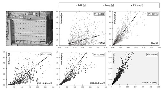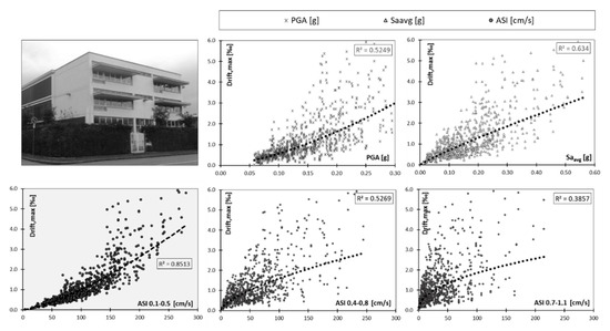 As previously introduced, the structures have been investigated with a massive number of analyses. The results have been organised in Figure 13 and Figure 14, respectively. The two figures report an image of the building and five plots. Each plot reports the IM scale versus the maximum drift. As matter of fact, the results are reported in terms of PGA, Saavg and ASI scale. The regression is evaluated for each plot. Additionally, according to other studies [9] the ASI value was calculated for 0.1–0.5, 0.4–0.8 and 0.7–1.1 s. The three intervals can be considered representative of the first period values of low-, mid- and high-rise buildings.