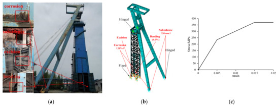 ANSYS was used for finite element modeling of headframes. In order to simplify the model and save time, BEAM188 element was used to model beams and columns, and LINK180 element was used to model inter-column supports. The FE model consisted of two parts: the vertical frame and the diagonal brace, as shown in Figure 3. The effective height of the vertical frame was 34.5 m. The bottom of vertical frame was fixed, and the diagonal brace was hinged at the bottom. The vertical frame and the diagonal brace were connected by bolts, which was simplified as hinged. The main components of the headframe were made of Q235 steel with elastic modulus , yield strength 235 MPa and density . The calculation diagram of steel material properties is shown in Figure 3c. In addition, damage was imposed on the headframe structure according to the field test results. The 20% corrosion of columns and brackets was simulated by reducing the section size. The loss of 7 inter-column supports and 3 beams of the vertical frame was simulated by life-and-death element technology. Beam bending with an offset of 0.6% of the beam length was simulated by defining curve. The support subsidence of 30 mm was simulated by applying displacement constraint. The loads acting on the headframe include permanent load, lifting load, tank beam load, wind load and other variable loads. For the convenience of calculation, the loads are simplified, and the self-weight of the headframe is simplified to the corners of each layer.