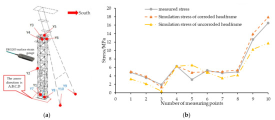 In order to verify the accuracy of the finite element calculation results, DH1205 surface strain gauge of Donghua Testing Technology Co., Ltd., (Taizhou, China) was used to measure the headframe strain. The strain gauge can be connected with the static and dynamic strain data acquisition system to measure the strain value of the surface of the tested structure. This can realize synchronous testing and analysis of dynamic stress and strain or vibration signals. In advance, finite element simulation was used to analyze headframe stress, and the measuring points were arranged in the position of high stress, as shown in Figure 4a. Taking a complete lift process as the time period for the measuring process, a total of 18 groups of strain data including 1 group of headframe static, 2 groups of headframe no-load operation and 15 groups of headframe heavy lifting were measured. The stress results of the test and finite element are shown in Figure 4b and Table 1. The damages obtained from the field test were considered in the finite element model.
