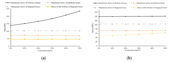During the long service of headframe, the surface of the component was not treated timely or improperly perhaps because the anti-corrosion protection layer fell off. Corroded elements will have a bad influence on the performance of the headframe. Therefore, we analyze the influence of different element corrosion on the mechanical properties of the headframe in this section. The corrosion was simulated by cutting the thickness. We define the corrosion rate as , in which t and are, respectively, the thickness of the corroded element and uncorroded element. In the actual environment, the corrosion of bottom column and the diagonal brace are more likely to occur and more serious, so the influence of the bottom column corrosion and the bottom of the diagonal brace corrosion on the mechanical properties of the headframe are studied, respectively. The stress changes of headframe by varying corrosion rates are shown in Figure 5.