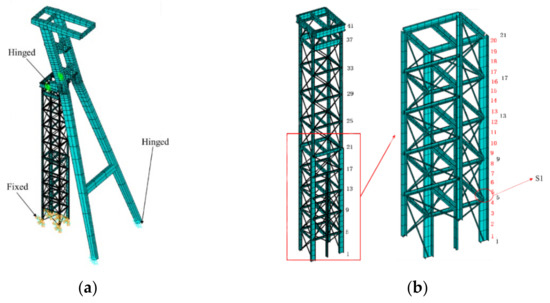The headframe model shown in Figure 6a was used for damage identification research. The model was simplified from the headframe structure in Section 3, and the element type, material properties and constraint conditions were the same as the headframe model in Section 3. The vertical frame was divided into ten layers according to height, and each layer column was divided into four elements. The number of column nodes and elements are shown in Figure 6b, where the black numbers are the node numbers, and the red numbers are the element numbers.