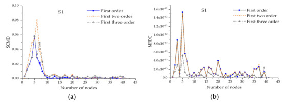 - For the single damage condition S1, the maximum mutation occurs between nodes 5–6, and mutations also occur between nodes 15–20, which will interfere with the judgment of damage location, as shown in Figure 7b.
