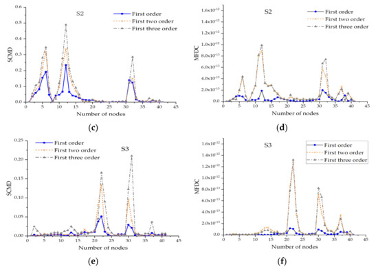 - For the multiple damage condition S2, the curve of modal flexibility difference curvature fluctuates greatly in the position without damage, and the recognition effect of superimposed curvature modal difference is better. For condition S3, when the same degree of damage occurs at different positions, the peak value of the curve is significantly different, which interfered with damage judgment. In Figure 7e,f, the curve also has certain mutation between nodes 37–38, resulting in misjudgment.