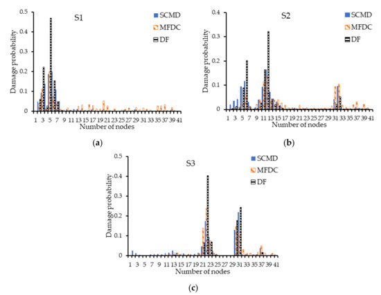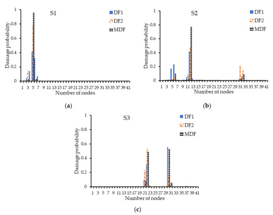 - For multiple damage condition S2, the damage locations at nodes 5–6 and 11–12 were accurately identified by using the one-stage fusion, and the damage probability of nodes 31–32 is smaller than the former. For multiple damage condition S3, the damage location at nodes 22–23 and nodes 30–31 was accurately identified by using the one-stage fusion, which corrects misjudgment of the single damage index method.