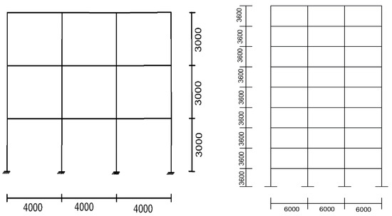 Elevations of the 3- and 9-story RC frame structures (unit: mm).