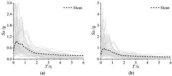 Detailed information on the NPL and PL ground motion records can be found in reference [21]. The selected NPL and PL ground motions are mainly recorded during strong earthquakes whose magnitudes range from 5.0 Mw to 8.0 Mw, which usually causes serious structural damage and collapse. For the NPL ground motion records, there are 22 pairs (44 individual components) of horizontal records (two orthogonal horizontal component records in each station). Figure 2 shows the mean spectra of the NPL and PL ground motion records.