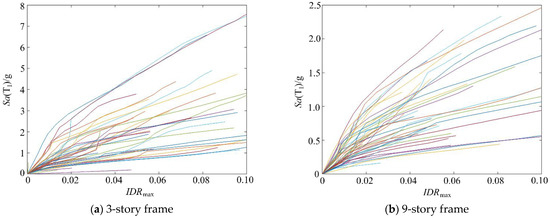The IDA curves of the frames are obtained by adjusting the seismic intensity of the 88 ground motions one by one until collapse occurs. Figure 3 shows the IDA curves of the three- and nine-story RC frames with an FSRCB equal to 1.2. For illustration, the IDA curves of the frames with other FSRCB values are not presented for the sake of brevity. Figure 4 and Figure 5 show the median IDA curves of the three- and nine-story RC frames with different FSRCBs, respectively. IDRmax is the maximum inter-story ratio (IDR) in the nonlinear dynamic analysis. The median IDA curves of the frames with a larger FSRCB usually have a larger lateral resistance capacity than those of the frames with a smaller FSRCB [21]. As shown in Figure 4 and Figure 5, for a specified value of IDR, the collapse capacity increases as the FSRCB increases.