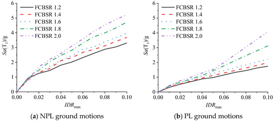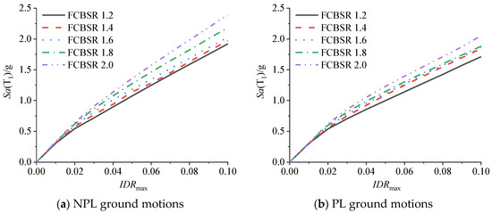 Figure 7b shows the median collapse capacities of the frames with different FSRCBs compared with those of the frame with FSRCB = 1.2. As shown in Figure 7b, the ratio increases as the FSRCB increases from 1.2 to 2.0. For the NPL ground motions, the collapse capacity of the frame with FSRCB = 2.0 is approximately two times that of the frame with FSRCB = 1.2. For the PL ground motions, the collapse capacity of the frame with FSRCB = 2.0 is approximately 1.5 times that of the frame with FSRCB = 1.2. This means that it is more efficient to improve the collapse capacity of the frames excited by the NPL ground motion records than those excited by the PL ground motion records.