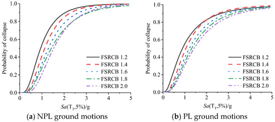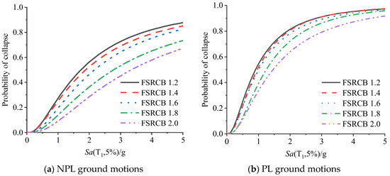 Collapse fragility curves are widely adopted to describe the probability of buildings sustaining damage under the excitation of strong earthquakes. Figure 6 shows the fragility curves relating to the collapse probability under the increasing seismic intensity measure of the three-story frames with various FSRCBs. The collapse probability decreases as the FSRCB increases from 1.2 to 2.0 under a specific seismic intensity for both NPL ground motions and PL ground motions for three-story RC frames.