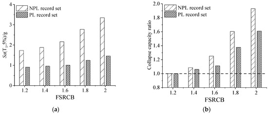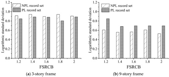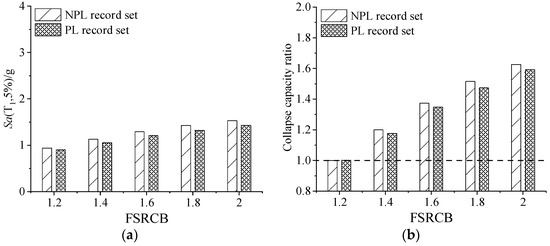Figure 7a shows the median collapse capacity of the three-story RC frames with various FSRCBs. The median collapse capacity increases as the FSRCB increases for both the NPL record set and the PL record set. The median collapse capacities of the RC frames excited by the PL record set are smaller than those of the frames excited by the NPL record set.