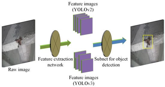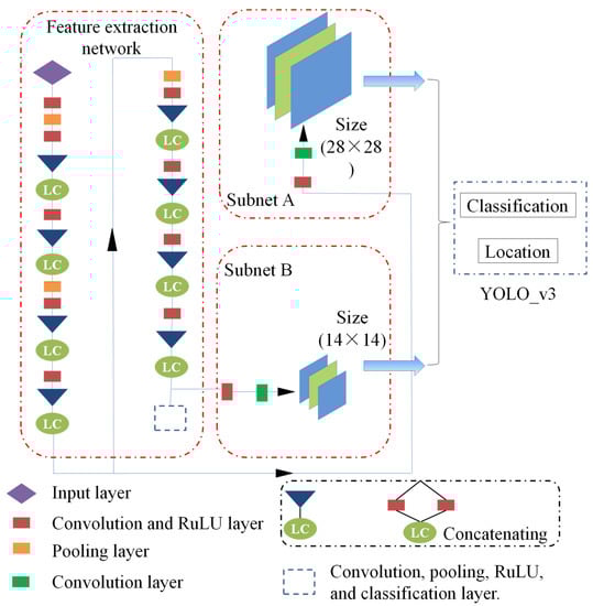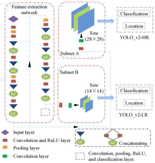 The YOLOv2 uses SqueezeNet as the feature extractor and selects the feature image of a certain layer as the input of the subnet (Subnet A or Subnet B in Figure 3). For the YOLOv2-HR (YOLOv2 with high-resolution feature images), the feature images of the 28 × 28 pixels are used as the input of the detection layer (Subnet A). Moreover, the YOLOv2 network returns the classification and location of the object.