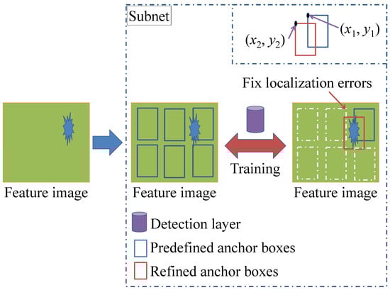 The subnet of the YOLOv2 uses anchor boxes to detect the location and classification of the defined object. Each anchor box can extract a subimage from the original image, and each subimage can obtain a large number of feature images after the convolution layer. These feature images can obtain the category through the classification layer and obtain the location through the regression layer (the detection process of each anchor box is independent). The use of anchor boxes improves the performance for the detection process of an object detector [] to detect objects in an image, and the selection of anchor boxes was realized by an automatic evaluation function (‘estimateAnchorBoxes’) of MATLAB (https://ww2.mathworks.cn/help/vision/ref/estimateanchorboxes.html, accessed on 10 August 2021). During detection (Figure 4), the feature images obtained by the feature extractor were used as the input of the subnet and then the anchor boxes were labeled into the image, and the mapping relationship between the anchor boxes and the defined image labels was formed through the neural network (the detection layer in Figure 4) composed of two convolution layers. The location error was gradually by reduced using minimizing the loss function. As shown in Figure 4, the coordinates of the predefined anchor box were (x1, y1), and those of the refined anchor box were (x2, y2). During training, the precise location of the anchor box was obtained by minimizing the loss function (squared error loss, SEL). Finally, tiled anchor boxes representing the background were removed and the anchor box with the object was retained.