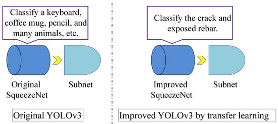 - The transfer learning network (SqueezeNet, retrained by bridge defect images) was used as the feature extractor of the YOLOv3, namely, improved YOLOv3-TL.