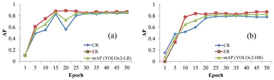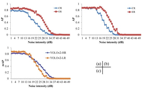 Figure 12a (YOLOv2-HR) and Figure 12b (YOLOv2-LR) show the variation in the AP values of the YOLOv2 under the influence of 1~50 dB noise. It can be found that the AP value gradually decreased with the increase in noise intensity and finally approached 0. Interestingly, the rate of descent of the CR curve was higher than that of ER. Therefore, it can be inferred that CR detection is more susceptible to noise. Interestingly, the comparisons of the YOLOv2-HR and YOLOv2-LR detection results (Figure 12c) indicate that the YOLOv2-HR had higher anti-noise ability, while the mAP of the YOLOv2-LR decreased faster than that of the YOLOv2-HR.