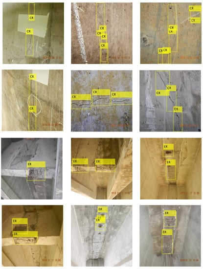An image dataset (for YOLO) consisted of 1660 RGB images (including crack images (namely, CR) and exposed rebar images (namely, ER)) of concrete bridges (along the Erenhot-Guangzhou and Guangzhou-Kunming Expressways; Figure 8a shows an example of a bridge) in China. Among them, 90% of the images were used for training and 10% for testing (evaluating) the performance of the YOLO, and all images were uniformly trimmed to 227 × 227 pixels. The ‘Image labeler’ toolbox in MATLAB was used to label defect objects (including the classification and anchor boxes of defects). Figure 8b shows two examples of the labeled images.
