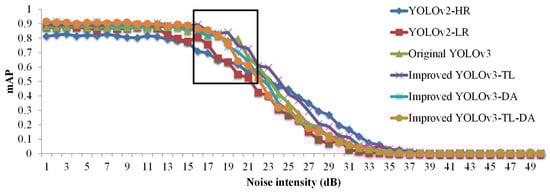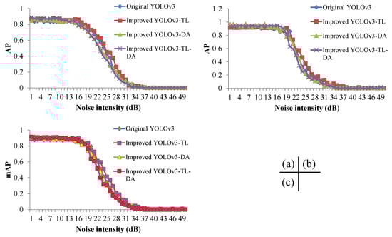 The testing data (YOLO) with noise were input into the YOLOv3 (including the original YOLOv3, improved YOLOv3-TL, improved YOLOv3-DA and improved YOLOv3-TL-DA) and the testing results are shown in Figure 14. Figure 14a,b show the AP values of CR and ER under the influence of different intensities of noise, and Figure 14c shows the mAP of the YOLOv3. The results illustrate that the original YOLOv3 has the same anti-noise ability as the improved YOLOv3. Compared with the YOLOv2, the YOLOv3 has higher anti-noise ability than the YOLOv2. In Figure 15, the mAP descent point of the YOLOv3 is later than that of the YOLOv2.