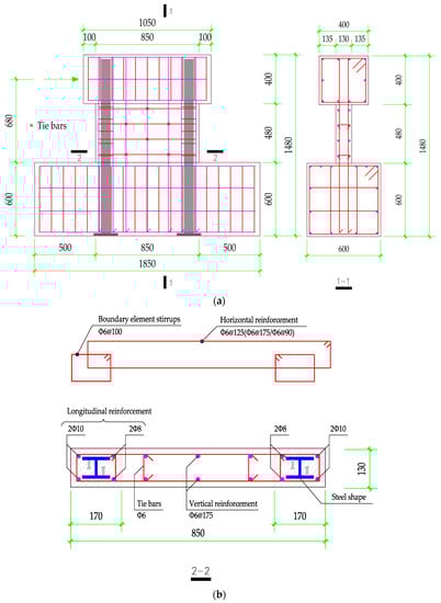 Nine squat SRC shear walls with a rectangular cross-section were designed according to the provisions of JGJ 138-2016 []. The studied variables included the axial load ratio (ALR), the area ratio of the embedded structural steel (steel ratio ) of the wall boundary, and the horizontal reinforcement ratio (). The ALRs were taken as 0.18, 0.26, and 0.35, respectively. ALR is defined as