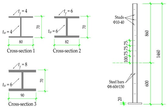 Since all specimens were designed to fail in shear, shear studs with a diameter of 10 mm were arranged on the flange and web of the structural steel to make an effective shear transition between the concrete and the steel sections. Due to the narrow spacing, the shear studs were arranged alternately on the web and flange with a spacing of 75 mm along with the specimen height, as shown in Figure 2. Additionally, short reinforcement bars were welded on the steel sections in the foundation zone to enhance the anchoring.