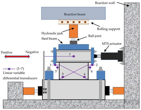 All the specimens were tested in a cantilever manner, using the setup presented in Figure 3. Each specimen was fixed on the floor through the foundation concrete block, of which the rigid displacement was eliminated by the horizontal jacks, steel beams and threaded rods. A vertical hydraulic jack and a steel beam with sufficient flexural stiffness were adopted to generate a uniform axial pressure to the wall. The cyclic lateral loading was achieved by two MTS hydraulic actuators. Each of them possessed a capacity of 900 kN.